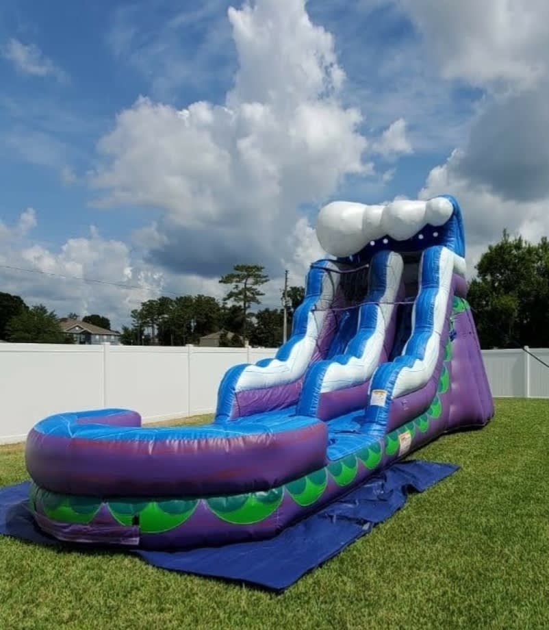 The Wave slide is 18 feet the inflatable sits at 12ft tall and 36ft long.This is a eye catcher when you see it.Your party or event will be blast and kids and adults will enjoy it.